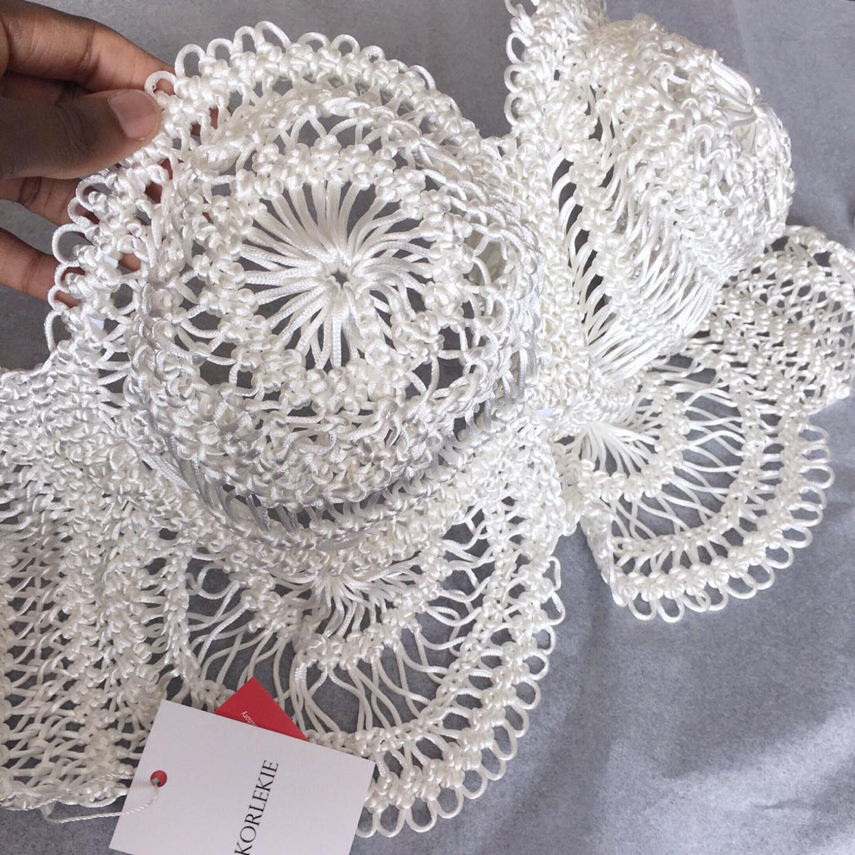 A sweetheart styled hand crocheted bustier top with underwire, intricate knit detailing & adjustable back tie